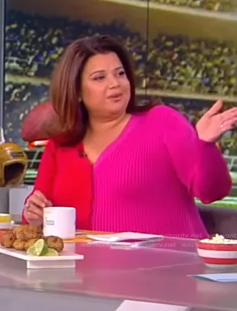 Ana Navarro on The View on ABC was spotted wearing this red and pink two-tone dress on The View on Feb 11 2022's episode. Ana's Dress is the Shoko Dress in Lava/Peony by Staud.