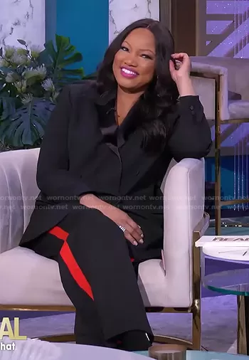 Garcelle Beauvais on The Real on BETher was spotted wearing this black blazer and side stripe pants on The Real on Feb 11 2022's episode. Garcelle's Jacket is the Tonal Lapel Double Breasted Blazer by Zara . Garcelle's Pants is the Side-Stripe Wide-Leg Pant by New York & Company.