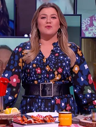 Kelly Clarkson on The Kelly Clarkson Show on NBC was spotted wearing this multicolored floral print dress on The Kelly Clarkson Show on Jan 22 2022's episode. Kelly's Dress is the Florita Dress by Anthropologie.