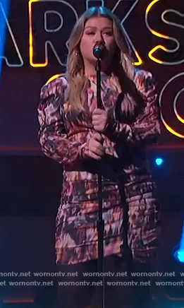 Kelly Clarkson on The Kelly Clarkson Show on NBC was spotted wearing this tie dye ruched mini dress on The Kelly Clarkson Show on Jan 08 2022's episode. Kelly's Dress is the Pieces ruched mini dress with drape detail and puff sleeves in abstract print by ASOS.