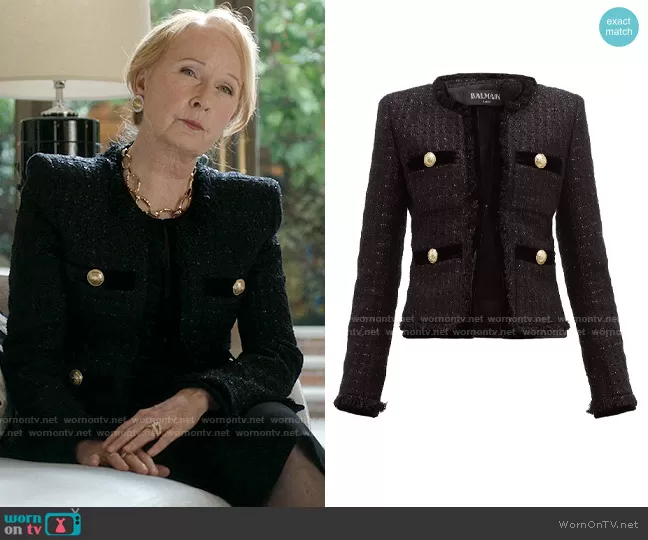 Nora Radford (played by Kate Burton) on Inventing Anna on Netflix was spotted wearing this black tweed jacket with gold buttons on Inventing Anna on episode 'Two Birds, One Throne' (1x03) in Feb 2022. Nora's Jacket is the Velvet-trim Metallic-tweed Jacket by Balmain.