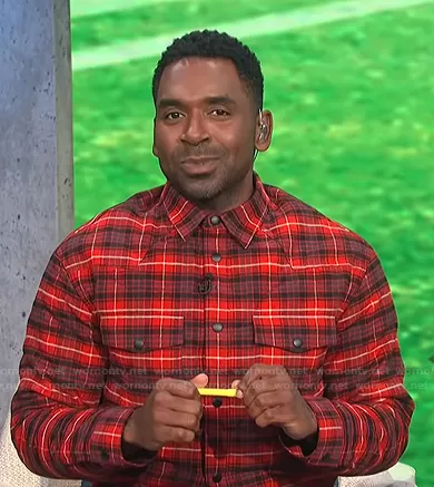 Justin Sylvester on E! News on E! was spotted wearing this red plaid shirt on E! News Daily Pop on Feb 14 2022's episode. Justin's Shirt is the Slim Fit Double Face Quilted Plaid Shirt Jacket by The Kooples.