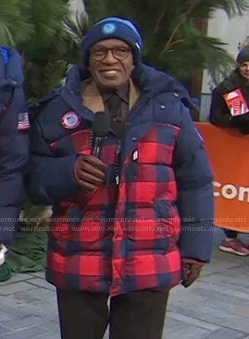 on Today on NBC was spotted wearing this navy and red check puffer jacket on Today on Feb 15 2022's episode. 's Jacket is the Team USA Removable Hood Down Jacket by Ralph Lauren . 's Hat is the Team USA Paralympic Team Pom Beanie by Nike.