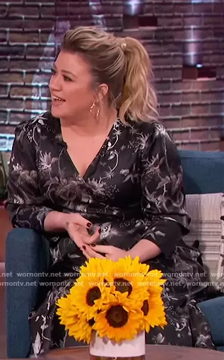 Kelly Clarkson on The Kelly Clarkson Show on NBC was spotted wearing this black floral satin wrap dress on The Kelly Clarkson Show on Nov 15 2021's episode. Kelly's Dress is the Tage Dress by All Saints.