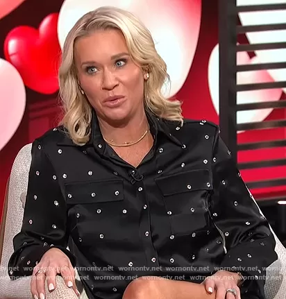 on E! News on E! was spotted wearing this black embellished satin blouse on E! News Daily Pop on Feb 15 2022's episode. 's Top is the Crystal-embellished satin blouse by David Koma.