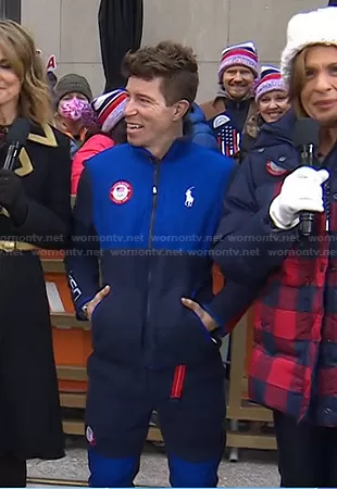 on Today on NBC was spotted wearing this blue fleece jacket and pants on Today on Feb 16 2022's episode. 's Jacket is the Team USA Hybrid Jacket by Ralph Lauren . 's Pants is the Team USA Hybrid Pant by Ralph Lauren.