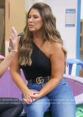 Emily Simpson on The Real Housewives of Orange County on Bravo was spotted wearing this black one shoulder tie top on The Real Housewives of Orange County on episode 'Edible Derangements' (16x10) in Feb 2022. Emily's Top is the Alloy Ribbed One-Shoulder Top by The Range . Emily's Belt is the Leather belt with torchon Double G buckle by Gucci.