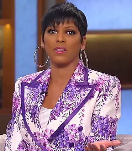 Tamron Hall on Tamron Hall Show on ABC was spotted wearing this lavender floral print blazer and pants on Tamron Hall Show on Feb 17 2022's episode. Tamron's Blazer is the Double-Breasted Floral Blazer by Dolce & Gabbana . Tamron's Pants is the Printed high-rise silk-blend pants by Dolce & Gabbana.