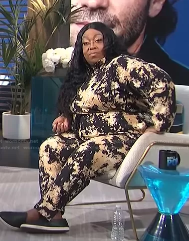 Loni Love on E! News on E! was spotted wearing this yellow tie dye jumpsuit on E! News Daily Pop on Feb 17 2022's episode. Loni's Jumpsuit is the Boiler Long Sleeve Drawstring Jumpsuit by Open Edit.