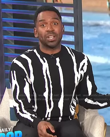 Justin Sylvester on E! News on E! was spotted wearing this black striped sweater on E! News Daily Pop on Feb 17 2022's episode. Justin's Sweater is the Vertical Jacquard Sweater by Zara.