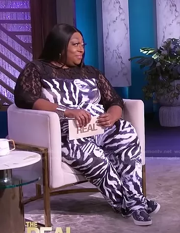 Loni Love on The Real on BETher was spotted wearing this zebra print lace jumpsuit on The Real on Feb 17 2022's episode. Loni's Jumpsuit is the Lana Animal Print Lace Jumpsuit by Coldesina.