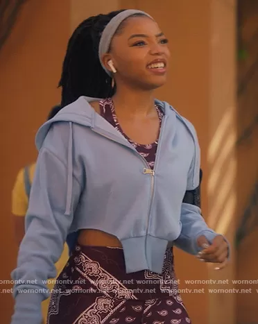 Jazlyn Forster (played by Chloe Bailey) on Grown-ish on Freeform was spotted wearing this burgundy bandana print leggings on Grown-ish on episode 'OK Not To Be Ok' (4x13) in Feb 2022. Jazlyn's Top is the Geri Techflex Bra by Splits59 . Jazlyn's Pants is the Ava High Waist Techflex Leggings by Splits59 . Jazlyn's Sweater is the Cut Out Sweatshirt by Zara.