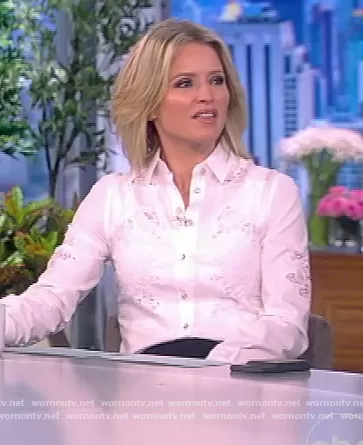 Sara Haines on The View on ABC was spotted wearing this white floral lace inset blouse on The View on Feb 18 2022's episode. Sara's Top is the Chantilly lace-paneled cotton-blend poplin shirt by Dolce & Gabbana.