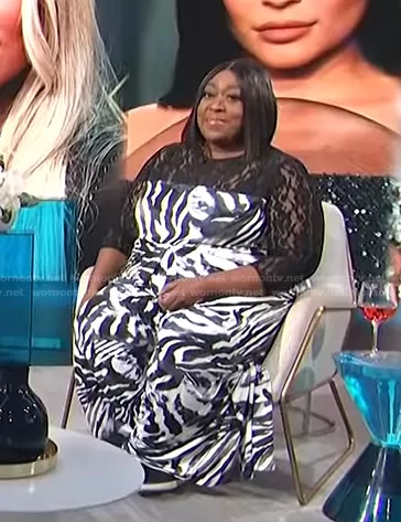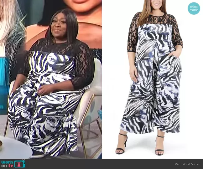 Loni Love on E! News on E! was spotted wearing this zebra print lace jumpsuit on E! News Daily Pop on Feb 18 2022's episode. Loni's Jumpsuit is the Lana Animal Print Lace Jumpsuit by Coldesina.