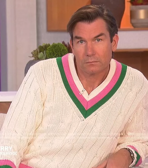 Jerry O'Connell on The Talk on CBS was spotted wearing this white cable knit stripe trim sweater on The Talk on Jul 07 2022's episode. Jerry's Sweater is the Cricket Sweater by Rowing Blazers.