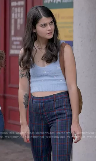 Samantha Fink (played by Sofia Black-D'Elia) on Single Drunk Female on Freeform was spotted wearing this fluffy blue embroidered tank top and plaid pants on Single Drunk Female on episode 'Look Me Up Sometime' (1x06) in Feb 2022. Sam's Top is the Embroidered Fluffy Tank in Mid Blue by New Look . Sam's Pants is the Slim Ankle Plaid Pants by Gap.
