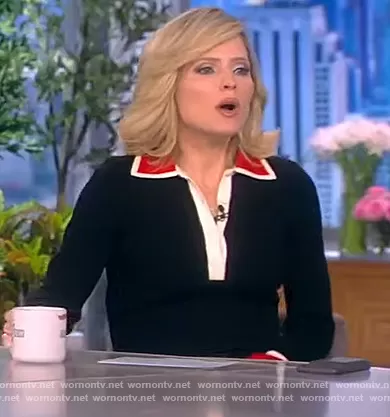 Sara Haines on The View on ABC was spotted wearing this black colorblock sweater polo on The View on Feb 21 2022's episode. Sara's Sweater is the Pia Rib-Knit Wool-Blend Polo by Alice + Olivia.