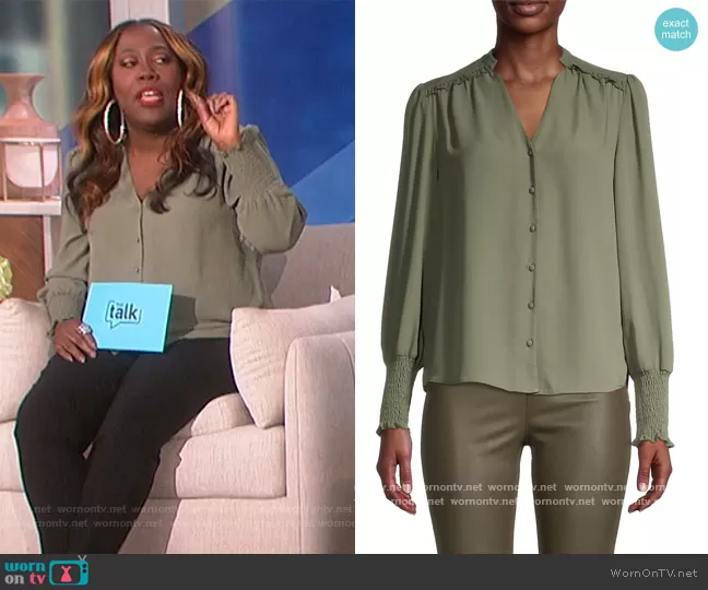 Sheryl Underwood on The Talk on CBS was spotted wearing this green v-neck blouse on The Talk on Feb 21 2022's episode. Sheryl's Top is the Smocked-Cuff V-Neck Blouse by Nanette Nanette Lepore.