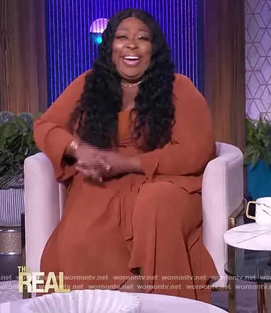 Loni Love on The Real on BETher was spotted wearing this brown wrap dress on The Real on Feb 21 2022's episode. Loni's Dress is the Fleetwood Long Sleeve Wrap Maxi Dress by City Chic.