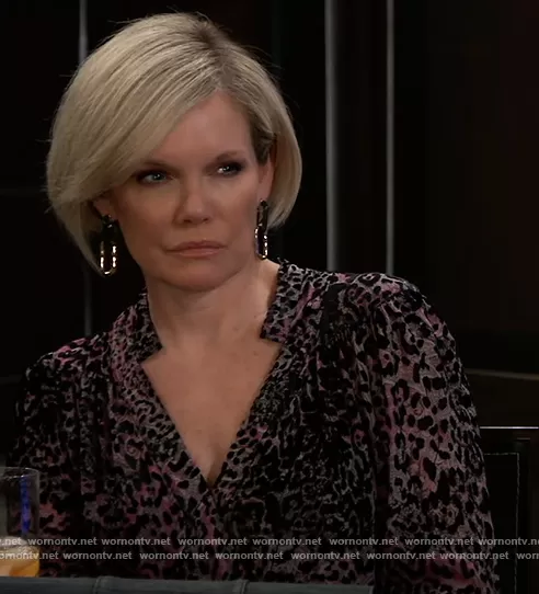 Ava Jerome (played by Maura West) on General Hospital on ABC was spotted wearing this leopard print blouse on General Hospital on Feb 22 2022's episode. Ava's Top is the Tori Velour Animal-Print Top by Zadig and Voltaire.
