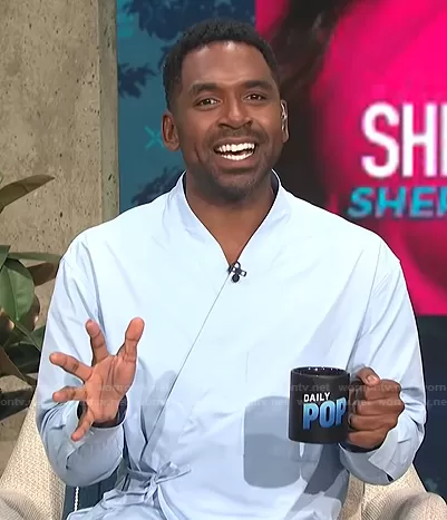 Justin Sylvester on E! News on E! was spotted wearing this blue wrap shirt on E! News Daily Pop on Feb 22 2022's episode. Justin's Shirt is the Crossover Cotton Shirt by Zara.