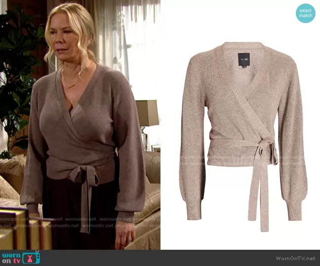 Brooke Logan (played by Katherine Kelly Lang) on The Bold and the Beautiful on CBS was spotted wearing this taupe wrap sweater on The Bold and the Beautiful on Feb 22 2022's episode. Brooke's Sweater is the Lodi Wrap Cardigan by Le Ore.