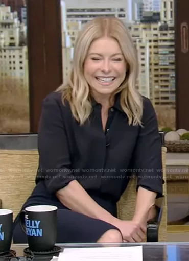 Kelly Ripa on Live with Kelly and Mark on Disney ABC Home Entertainment was spotted wearing this black shirt and pencil skirt on Live with Kelly and Ryan on Feb 23 2022's episode. Kelly's Top is the The Simone Blouse by Numi . Kelly's Skirt is the Arreton Skirt by Roland Mouret . Kelly's Shoes is the Suede Pumps by by Gianvito Rossi.