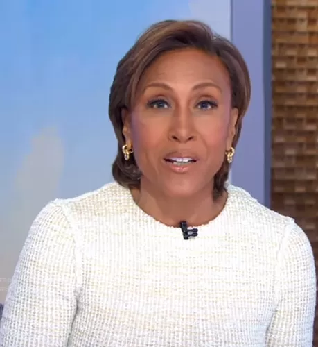 Robin Roberts on Good Morning America on ABC was spotted wearing this ivory short sleeve knit dress on Good Morning America on Feb 23 2022's episode. Robin's Dress is the Stretch Boucle Knit Dress by St John.