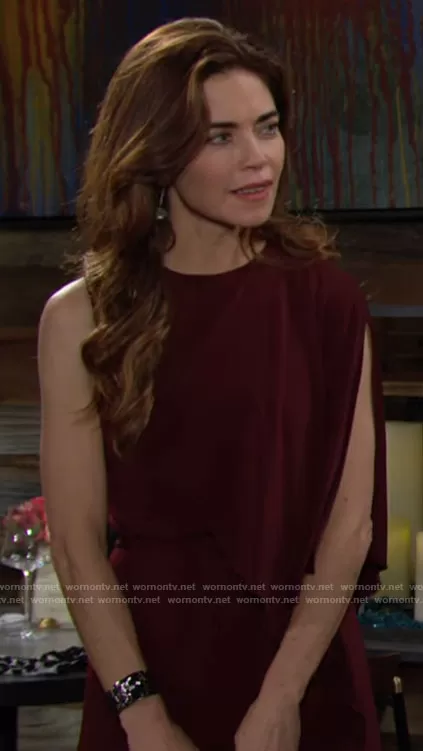 Victoria Newman (played by Amelia Heinle) on The Young and the Restless on CBS was spotted wearing this red one sleeve dress on The Young and the Restless on Feb 23 2022's episode. Victoria's Dress is the Melissa Midi Dress by Halston.