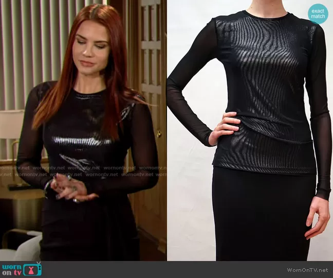 Sally Spectra (played by Courtney Hope) on The Young and the Restless on CBS was spotted wearing this metallic top with mesh sleeves on The Young and the Restless on Feb 18 2022's episode. Sally's Top is the Long Sleeve Top w/ Knit Mesh Overlay by Joeffer Caoc.
