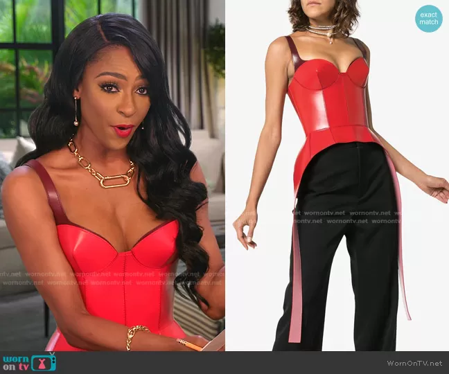 Guerdy Abraira (played by Guerdy Abraira) on The Real Housewives of Miami on Peacock was spotted wearing this red corset top on The Real Housewives of Miami on episode 'Sushi Rolls and Wedding Woes' (4x02) in Dec 2021. Guerdy's Top is the Two-Tone Bustier Top by Alexander McQueen.