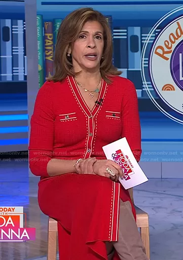 Hoda Kotb on Today on NBC was spotted wearing this red contrast trim button front dress on Today on May 06 2022's episode. Hoda's Dress is the Esmeralda Pickstitch Long Sleeve Knit Shirtdress by Sandro.