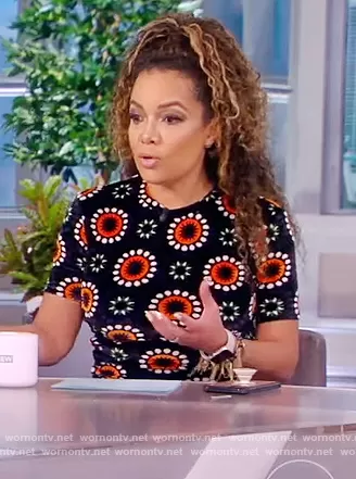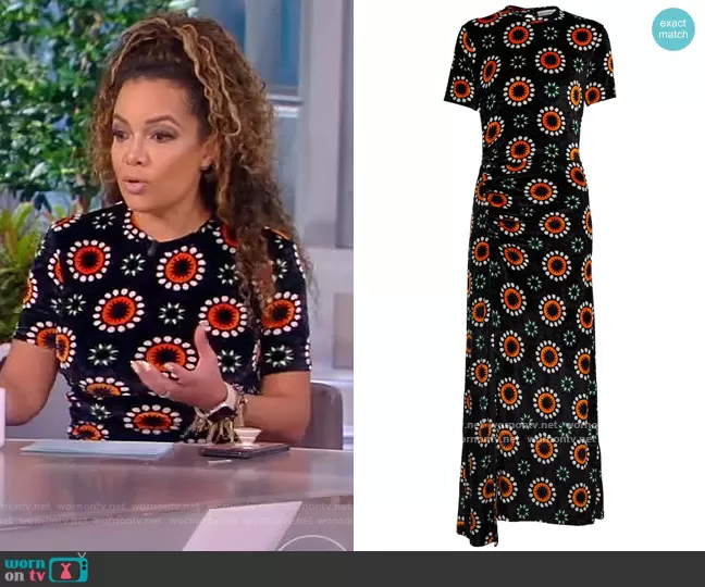 Sunny Hostin on The View on ABC was spotted wearing this black floral print sheath dress on The View on Feb 24 2022's episode. Sunny's Dress is the Floral-jacquard velvet side-slit dress by Paco Rabanne.