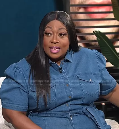 Loni Love on E! News on E! was spotted wearing this puff sleeve denim jumpsuit on E! News Daily Pop on Feb 24 2022's episode. Loni's Jumpsuit is the Belted Puff Sleeve Jumpsuit by Ashley Stewart.