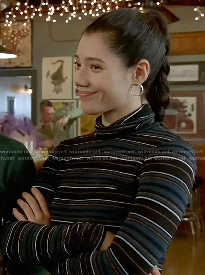 Violet Mikami (played by Hanako Greensmith) on Chicago Fire on NBC was spotted wearing this striped turtleneck on Chicago Fire on episode 'Fire Cop' (10x13) in Feb 2023. Violet's Top is the Audrey Turtleneck Top by Veronica Beard.