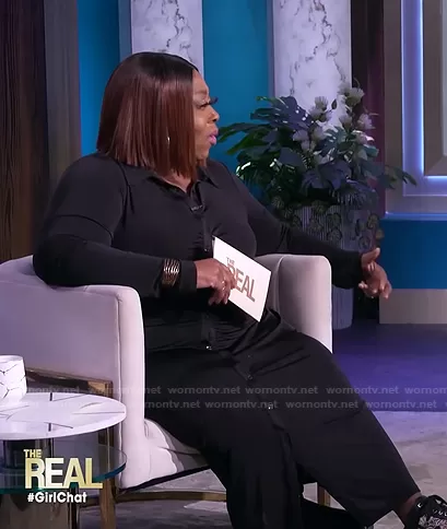 Loni Love on The Real on BETher was spotted wearing this black ruched button front dress on The Real on Feb 24 2022's episode. Loni's Dress is the Shimmer Polo Long Sleeve Maxi Dress by Good American.