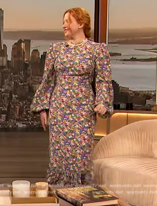 on The Drew Barrymore Show on CBS was spotted wearing this floral print midi dress on The Drew Barrymore Show on Feb 24 2022's episode. 's Dress is the The Villanelle ruffled floral-print crepe midi dress by The Vampires Wife . 's Shoes is the Belle Colorblock Slingback Pumps by Roger Vivier.