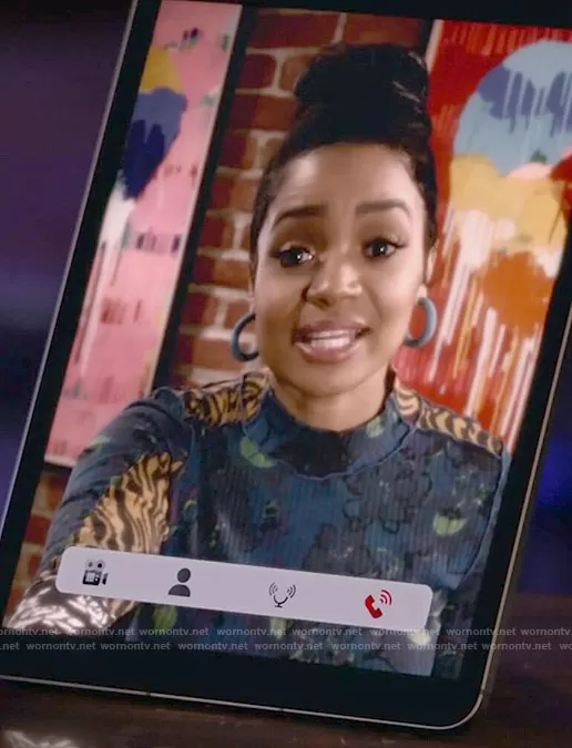 Randi (played by Kyla Pratt) on Call Me Kat on Fox was spotted wearing this patchwork print top on Call Me Kat on episode 'Call Me Señor Don Gato' (2x08) in Feb 2022. Randi's Top is the Meadow Mix Top in Blue Combo by Free People.
