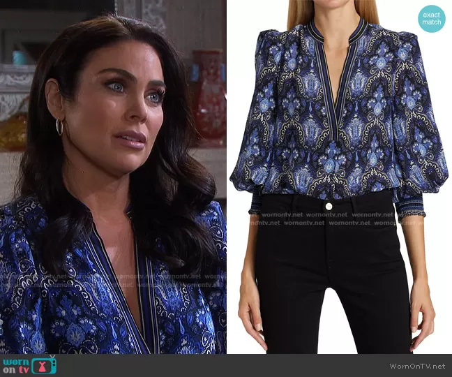 Chloe Lane (played by Nadia Bjorlin) on Days of our Lives on Peacock was spotted wearing this blue printed v-neck blouse on Days of our Lives on Feb 25 2022's episode. Chloe's Top is the Sheila Silk Blouson-Sleeve Blouse in Urban Medallion by Alice + Olivia.