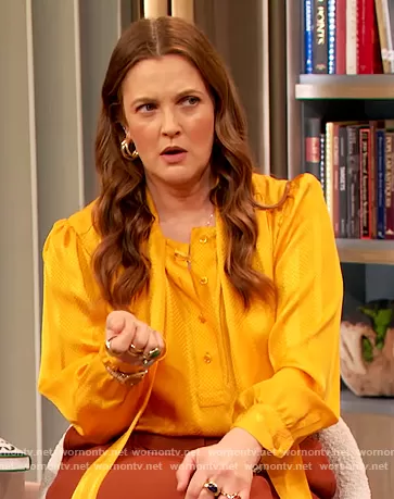 Drew Barrymore on The Drew Barrymore Show on CBS was spotted wearing this yellow jacquard tie neck blouse on The Drew Barrymore Show on Feb 25 2022's episode. Drew's Top is the Pussy-bow silk-jacquard blouse by Saint Laurent