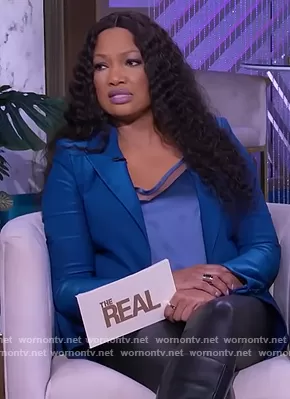 Garcelle Beauvais on The Real on BETher was spotted wearing this blue mesh trim satin top on The Real on Feb 25 2022's episode. Garcelle's Top is the Mesh Detail Satin Cami by Bebe.