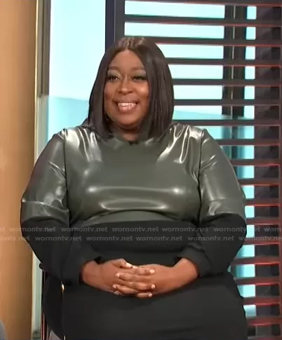 Loni Love on E! News on E! was spotted wearing this black and green leather colorblock dress on E! News Daily Pop on Feb 25 2022's episode. Loni's Dress is the Colorblock Faux Leather Hoodie Dress by Ashley Stewart.