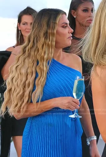 Adriana de Moura (played by Adriana de Moura) on The Real Housewives of Miami on Peacock was spotted wearing this blue pleated one-shoulder dress on The Real Housewives of Miami on episode 'Flirting at the Faena' (4x06) in Jan 2022. Adriana's Dress is the Luisa Pleated Satin Midi Dress by Intermix.