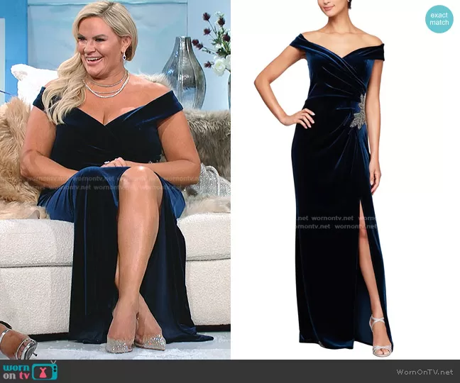 Heather Gay on The Real Housewives of Salt Lake City on Bravo was spotted wearing this blue off-shoulder velvet dress on The Real Housewives of Salt Lake City on episode 'Reunion Part 1' (2x22) in Feb 2022. Heather's Dress is the Off the Shoulder Ruched Velvet Gown by Alex Evenings . Heather's Shoes is the Amber Ghost Embellished Pumps by Alexandre Vauthier.