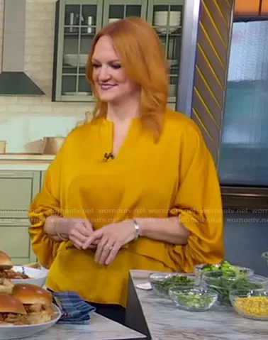 on Good Morning America on ABC was spotted wearing this yellow balloon sleeve top on Good Morning America on Feb 28 2022's episode. 's Top is the Kenna Tiered Satin Blouse by Lafayette 148 New York.