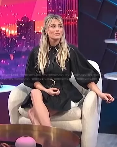 on E! News on E! was spotted wearing this black balloon sleeve belted dress on E! News Nightly Pop on Feb 18 2022's episode. 's Dress is the Recurrence Button Up Dress by Aje.