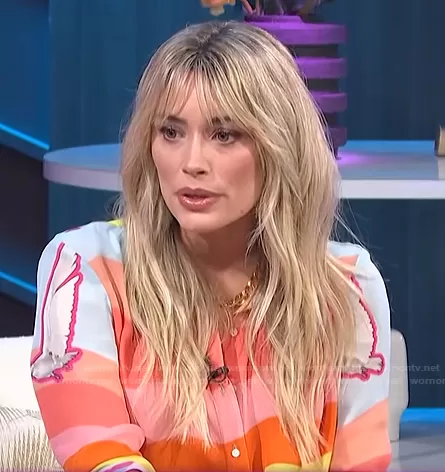 on E! News on E! was spotted wearing this printed blouse on E! News Nightly Pop on Feb 16 2022's episode. 's Top is the Boyfriend Stripe Silk Blend Shirt by Nicole Miller.