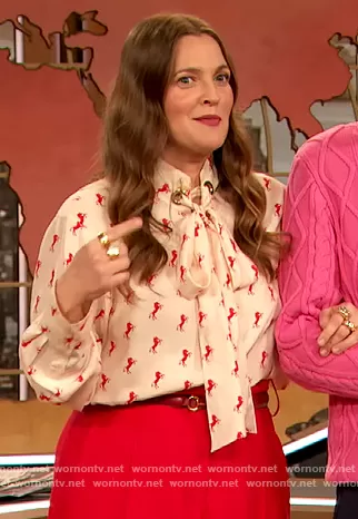 Drew Barrymore on The Drew Barrymore Show on CBS was spotted wearing this white horse print blouse on The Drew Barrymore Show on Feb 28 2022's episode. Drew's Top is the Printed pussy-bow silk-crepe blouse by Chloe . Drew's Pants is the High waisted press-crease trousers by Oscar de la Renta.