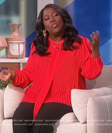 Sheryl Underwood on The Talk on CBS was spotted wearing this red pleated tie neck blouse on The Talk on Feb 28 2022's episode. Sheryl's Top is the Tie-Neck Pleated Blouse by Nanette By Nanette Lepore.