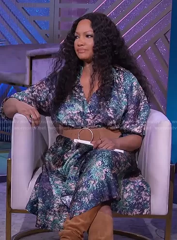 Garcelle Beauvais on The Real on BETher was spotted wearing this abstract print wrap dress on The Real on Feb 28 2022's episode. Garcelle's Dress is the Night Grass Silk Wrap Dress by Ginger & Smart.